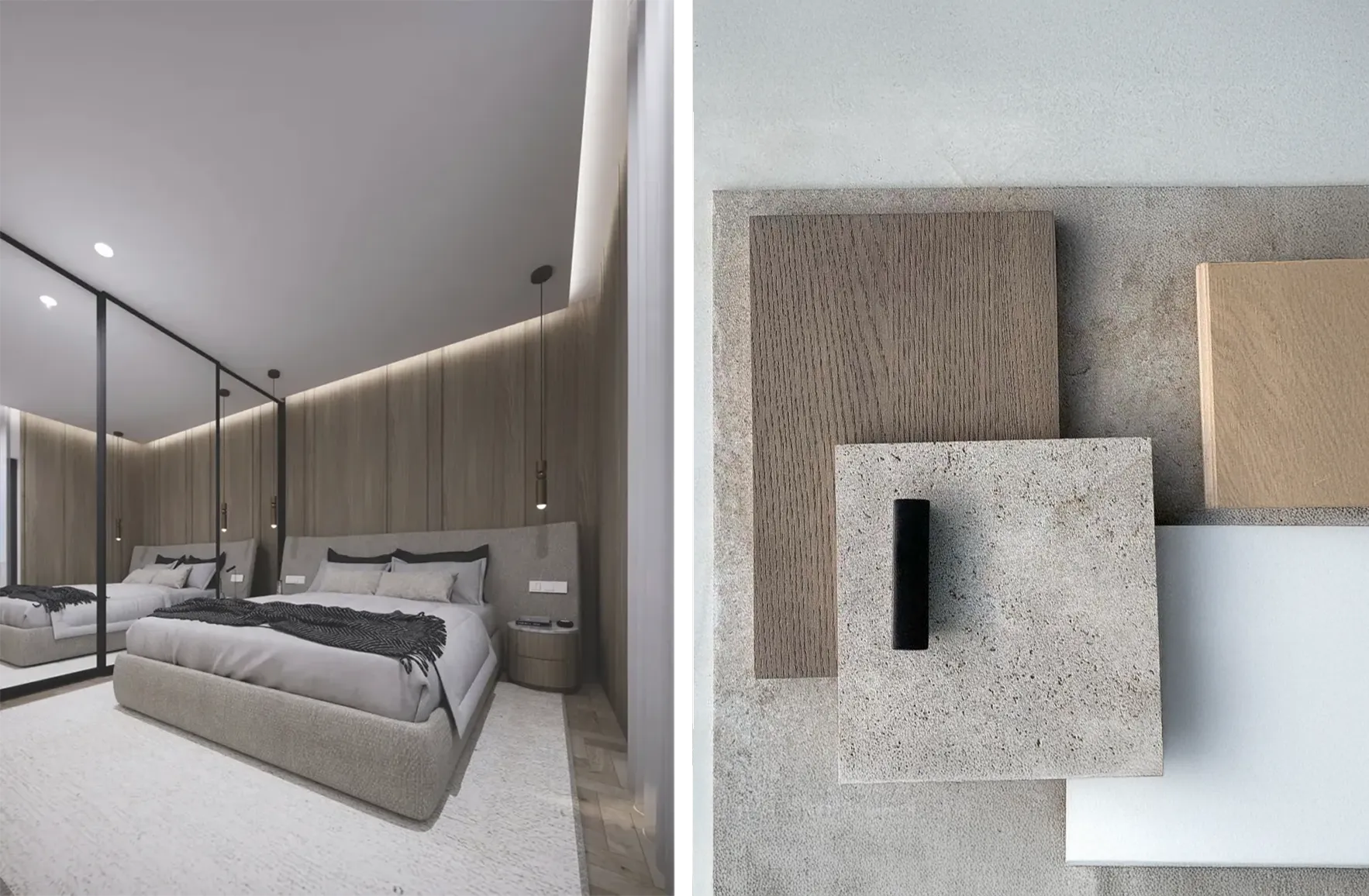 Ο χώρος αναπτύσσεται σε καθαρές, ήπιες γραμμές, αποφεύγοντας τις υπερβολές, διατηρώντας ωστόσο έναν φιλικό και θερμό χαρακτήρα. Το φυσικό δρύινο πάτωμα, οι ντουλάπες με καθρέφτες, τα υφάσματα, οι ξύλινες επενδύσεις δίνουν στο εσωτερικό βάθος και οπτική ποιότητα, σε απόλυτη αρμονία με τη γήινη χρωματική παλέτα.