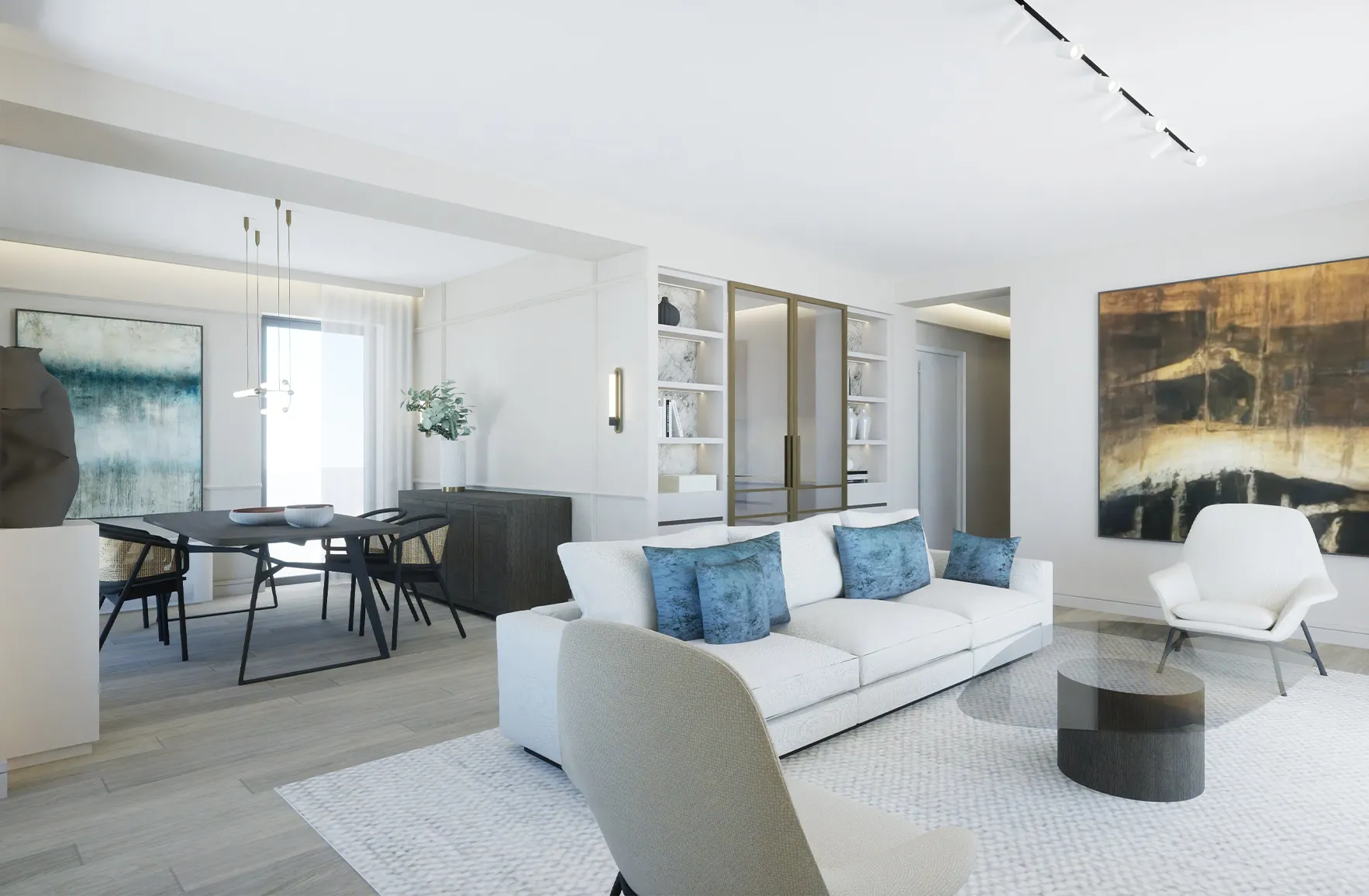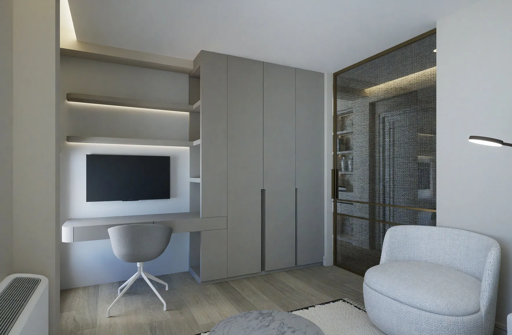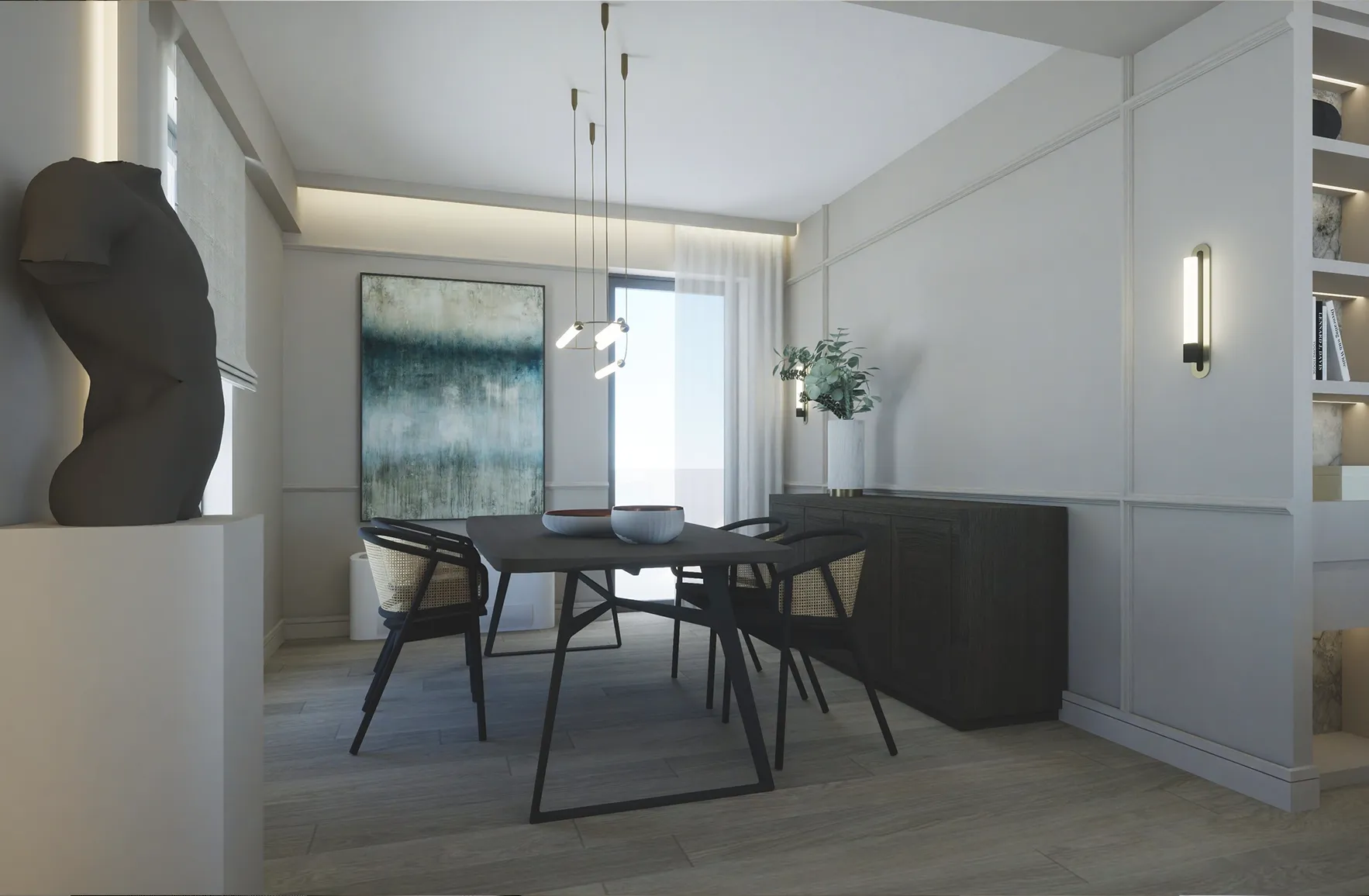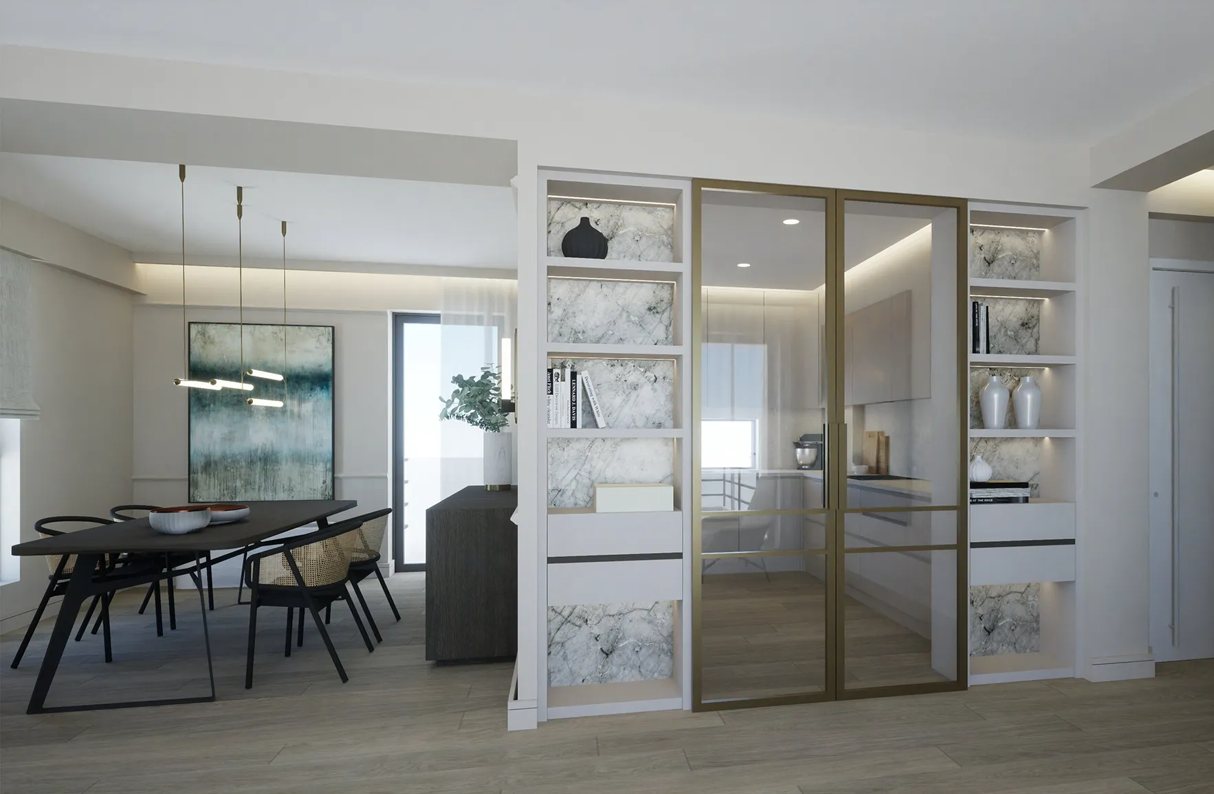 A Greek couple based in Marseille acquired this home as their personal retreat during visits to Athens. The goal was to create a contemporary and functional living space welcoming, calm, and subtly enriched with art and crafted detail. The design relied on natural materials and clean transitions. Oak wood flooring adds warmth, while sliding partitions with metal frames, some with glass, others combining fabric and glass, offer a sense of privacy while letting natural light travel deep into the space. A key architectural moment unfolds in the kitchen. Though small and limited to a single window, it was designed as a separate room, not part of the open plan, in line with the client’s wish. The wall facing the living area is a custom-built bookshelf, seamlessly incorporating a glass-panelled door that allows light to flow in while maintaining spatial clarity and privacy. The overall atmosphere is quiet and personal, with art thoughtfully placed throughout, forming a home of elegant restraint and emotional warmth.
