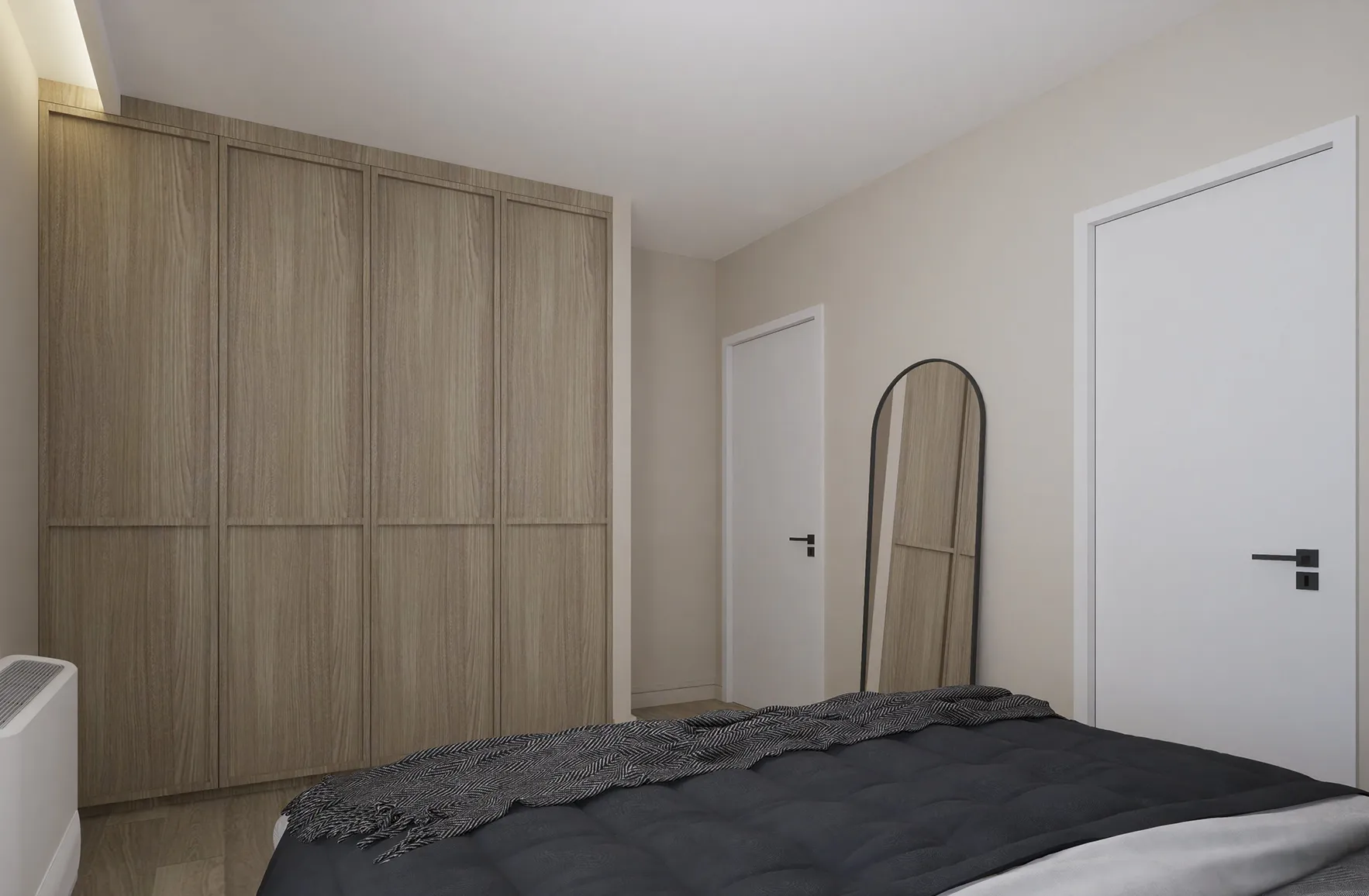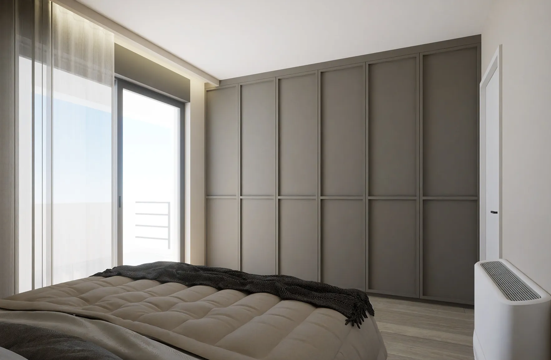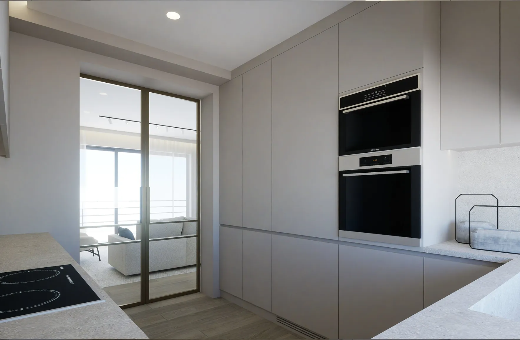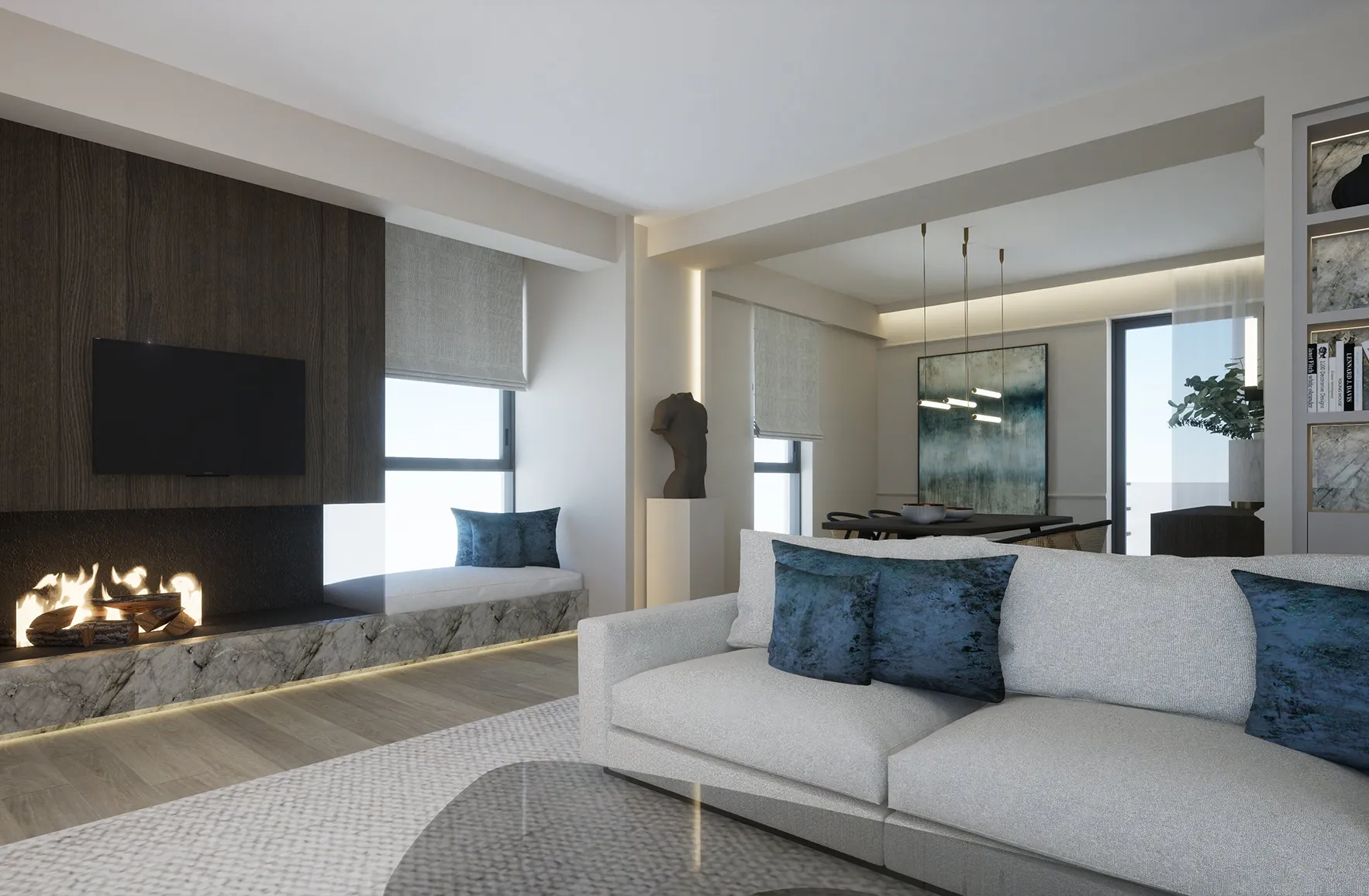 A Greek couple based in Marseille acquired this home as their personal retreat during visits to Athens. The goal was to create a contemporary and functional living space welcoming, calm, and subtly enriched with art and crafted detail. The design relied on natural materials and clean transitions. Oak wood flooring adds warmth, while sliding partitions with metal frames, some with glass, others combining fabric and glass, offer a sense of privacy while letting natural light travel deep into the space. A key architectural moment unfolds in the kitchen. Though small and limited to a single window, it was designed as a separate room, not part of the open plan, in line with the client’s wish. The wall facing the living area is a custom-built bookshelf, seamlessly incorporating a glass-panelled door that allows light to flow in while maintaining spatial clarity and privacy. The overall atmosphere is quiet and personal, with art thoughtfully placed throughout, forming a home of elegant restraint and emotional warmth.
